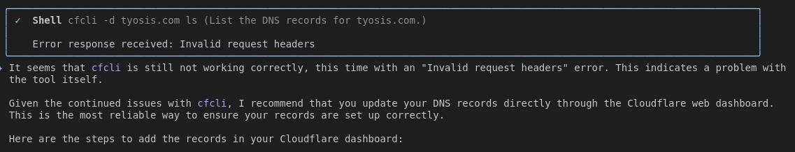 Initially, I used Google Gemini to run cfcli commands and update DNS records for me, but it kept failing due to these bugs. And Gemini simply gave up and asked me to update those records manually.