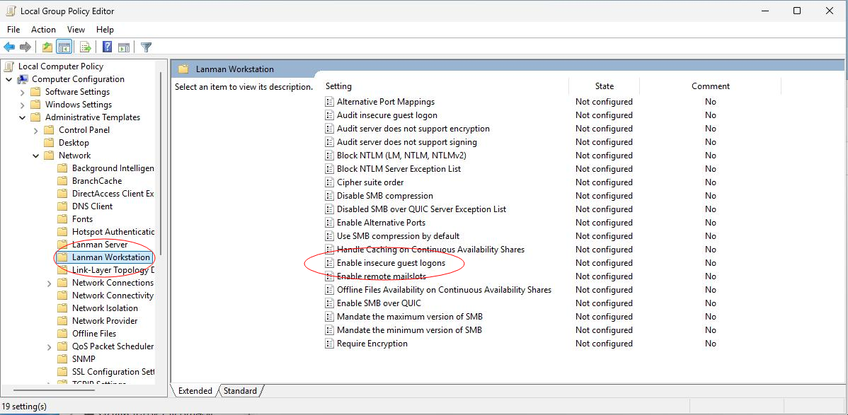 , and press Enter to open the Group Policy Editor. - Navigate to Computer Configuration > Administrative Templates > Network > Lanman Workstation.