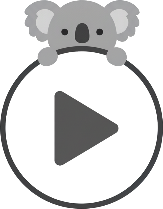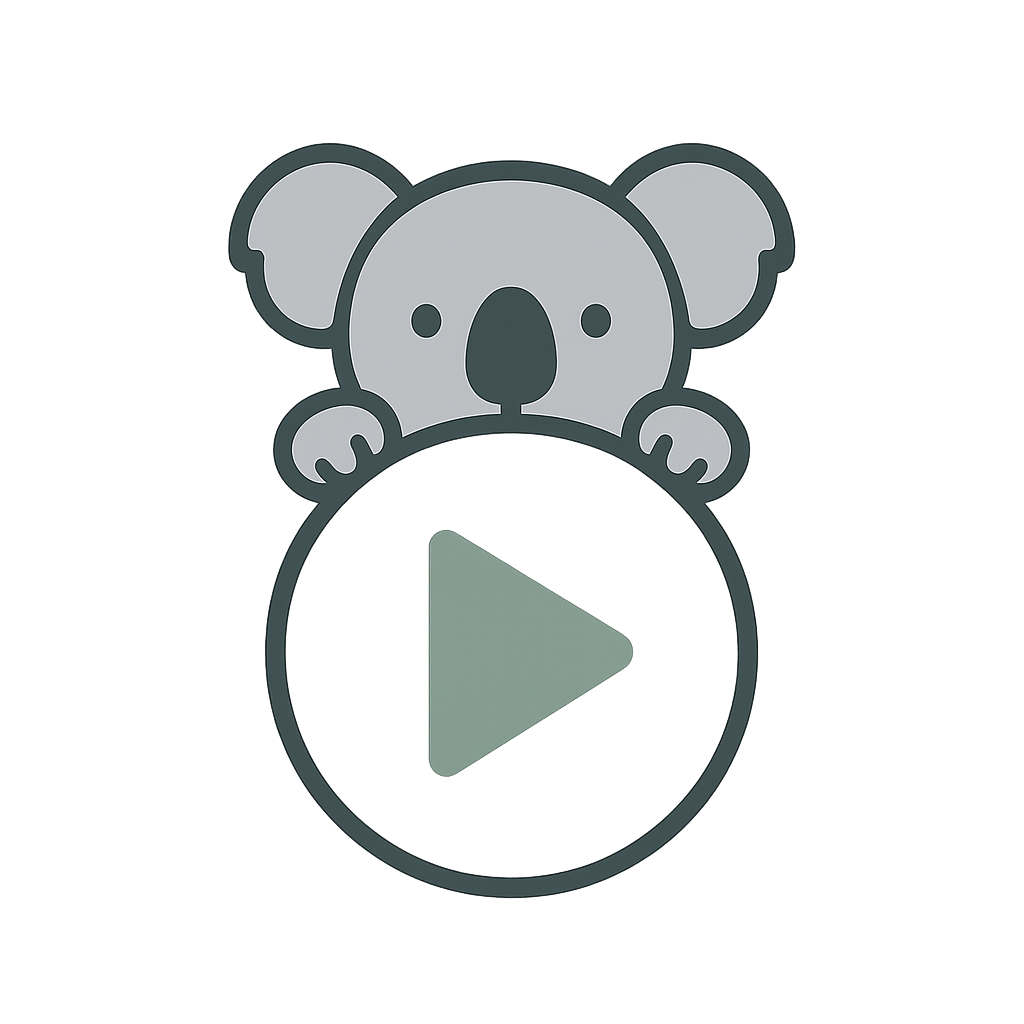 A minimalist, flat design vector logo icon. A cute, stylized soft-grey koala is peeking over the top of a large, central white circle. Inside the white circle is a simple, eucalyptus-green "play" button symbol (▶). The design must have clean lines, no gradients, and be on a transparent background. It should be designed to be clear and recognizable as a small browser extension icon.